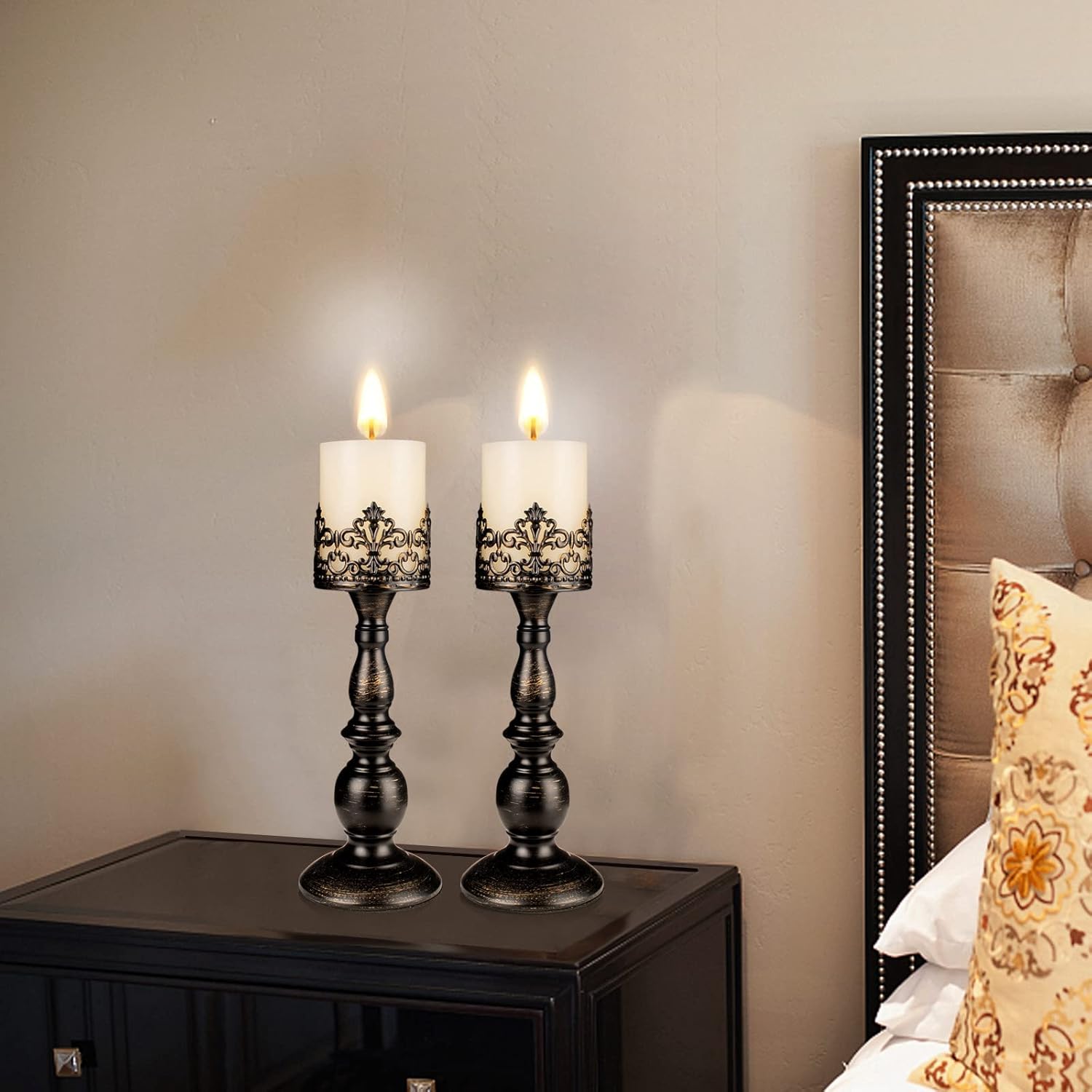 Candle Holders for Pillar Candles Gothic Matte Black Vintage Tall Candle Holders Set of 2 Decorative Large Table Centerpieces Candle Stand Decor (Distressed Black 2PCS A)