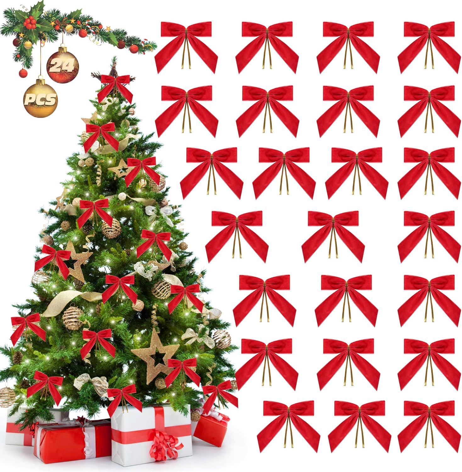 Red Velvet Bows for Christmas Tree Decorations, 24 Pcs Premium Velvet Ribbon Bows, Christmas Tree Ornaments for Xmas Wreaths, Gift Toppers & Holiday Home Decor(1" Width, 3.5x3.5 Inch)